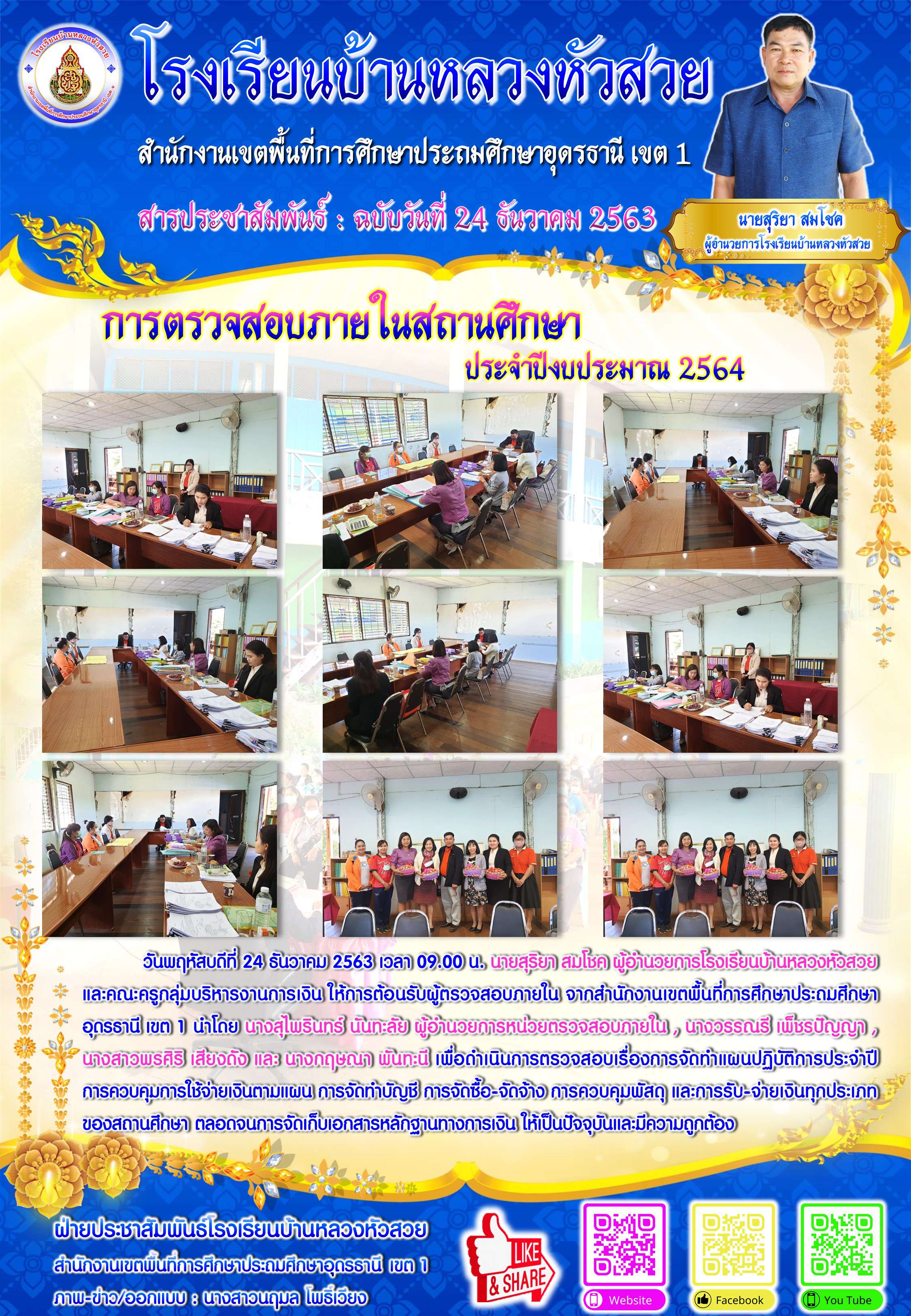 วันพฤหัสบดีที่ 24 ธันวาคม 2563 เวลา 09.00 น. นายสุริยา สมโชค ผู้อำนวยการโรงเรียนบ้านหลวงหัวสวย และคณะครูกลุ่มบริหารงานการเงิน ให้การต้อนรับผู้ตรวจสอบภายใน จากสำนักงานเขตพื้นที่การศึกษาประถมศึกษาอุดรธานี เขต 1 นำโดย นางสุไพรินทร์ นันทะลัย ผู้อำนวยการหน่วยตรวจสอบภายใน , นางวรรณรี เพ็ชรปัญญา , นางสาวพรศิริ เสียงดัง และ นางกฤษณา พันทะนี เพื่อดำเนินการตรวจสอบเรื่องการจัดทำแผนปฏิบัติการประจำปี การควบคุมการใช้จ่ายเงินตามแผน การจัดทำบัญชี การจัดซื้อ-จัดจ้าง การควบคุมพัสดุ และการรับ-จ่ายเงินทุกประเภทของสถานศึกษา ตลอดจนการจัดเก็บเอกสารหลักฐานทางการเงิน ให้เป็นปัจจุบันและมีความถูกต้อง