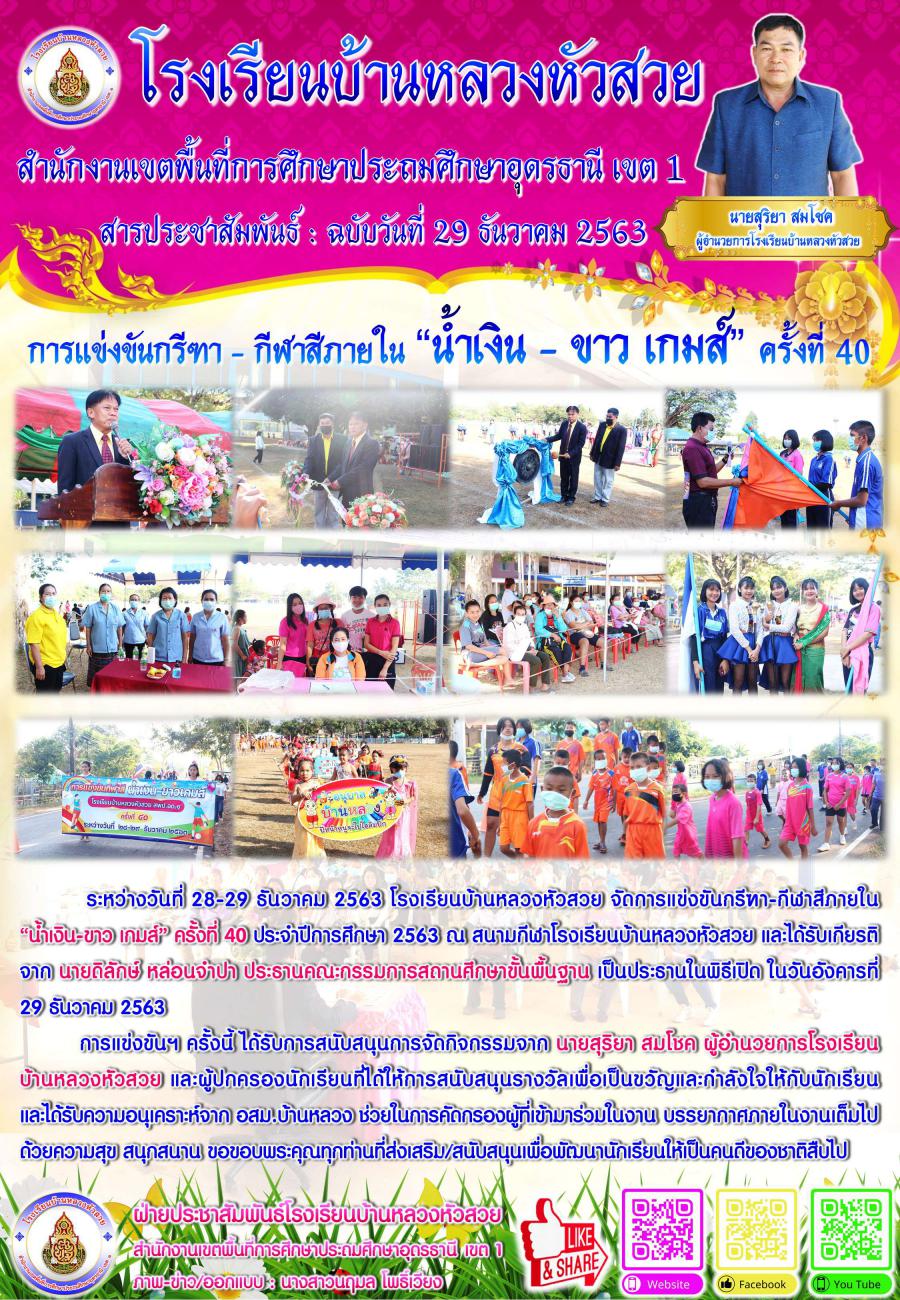 ระหว่างวันที่ 28-29 ธันวาคม 2563 โรงเรียนบ้านหลวงหัวสวย จัดการแข่งขันกรีฑา-กีฬาสีภายใน น้ำเงิน-ขาว เกมส์ ครั้งที่ 40 ประจำปีการศึกษา 2563 ณ สนามกีฬาโรงเรียนบ้านหลวงหัวสวย และได้รับเกียรติจาก นายดิลักษ์ หล่อนจำปา ประธานคณะกรรมการสถานศึกษาขั้นพื้นฐาน เป็นประธานในพิธีเปิด ในวันอังคารที่ 29 ธันวาคม 2563