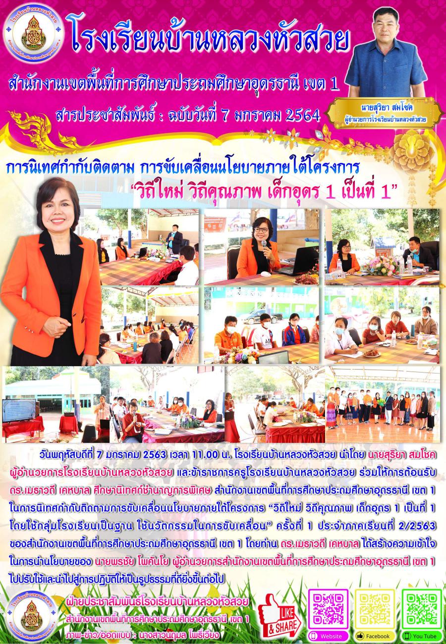 วันพฤหัสบดีที่ 7 มกราคม 2563 เวลา 11.00 น. โรงเรียนบ้านหลวงหัวสวย นำโดย นายสุริยา สมโชค ผู้อำนวยการโรงเรียนบ้านหลวงหัวสวย และข้าราชการครูโรงเรียนบ้านหลวงหัวสวย ร่วมให้การต้อนรับ ดร.เมธาวดี เคหบาล ศึกษานิเทศก์ชำนาญการพิเศษ สำนักงานเขตพื้นที่การศึกษาประถมศึกษาอุดรธานี เขต 1 ในการนิเทศกำกับติดตามการขับเคลื่อนนโยบายภายใต้โครงการ “วิถีใหม่ วิถีคุณภาพ เด็กอุดร 1 เป็นที่ 1 โดยใช้กลุ่มโรงเรียนเป็นฐาน ใช้นวัตกรรมในการขับเคลื่อน” ครั้งที่ 1 ประจำภาคเรียนที่ 2/2563 ของสำนักงานเขตพื้นที่การศึกษาประถมศึกษาอุดรธานี เขต 1 โดยท่าน ดร.เมธาวดี เคหบาล ได้สร้างความเข้าใจในการนำนโยบายของ นายพรชัย โพคันโย ผู้อำนวยการสำนักงานเขตพื้นที่การศึกษาประถมศึกษาอุดรธานี เขต 1 ไปปรับใช้และนำไปสู่การปฏิบัติให้เป็นรูปธรรมที่ดียิ่งขึ้นต่อไป