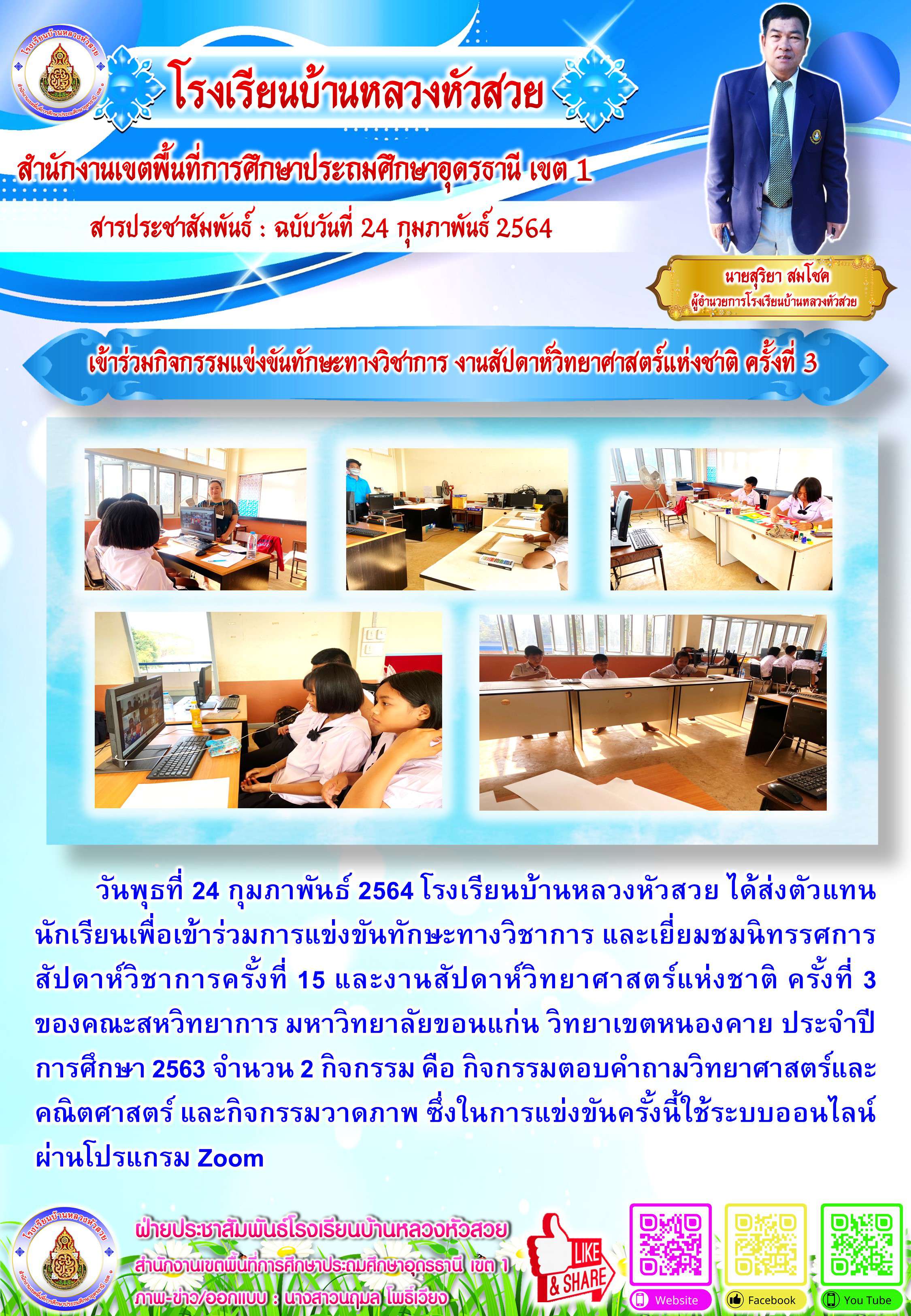 วันพุธที่ 24 กุมภาพันธ์ 2564 โรงเรียนบ้านหลวงหัวสวย ได้ส่งตัวแทนนักเรียนเพื่อเข้าร่วมการแข่งขันทักษะทางวิชาการ และเยี่ยมชมนิทรรศการสัปดาห์วิชาการครั้งที่ 15 และงานสัปดาห์วิทยาศาสตร์แห่งชาติ ครั้งที่ 3 ของคณะสหวิทยาการ มหาวิทยาลัยขอนแก่น วิทยาเขตหนองคาย ประจำปีการศึกษา 2563 จำนวน 2 กิจกรรม คือ กิจกรรมตอบคำถามวิทยาศาสตร์และคณิตศาสตร์ และกิจกรรมวาดภาพ ซึ่งในการแข่งขันครั้งนี้ใช้ระบบออนไลน์ผ่านโปรแกรม Zoom