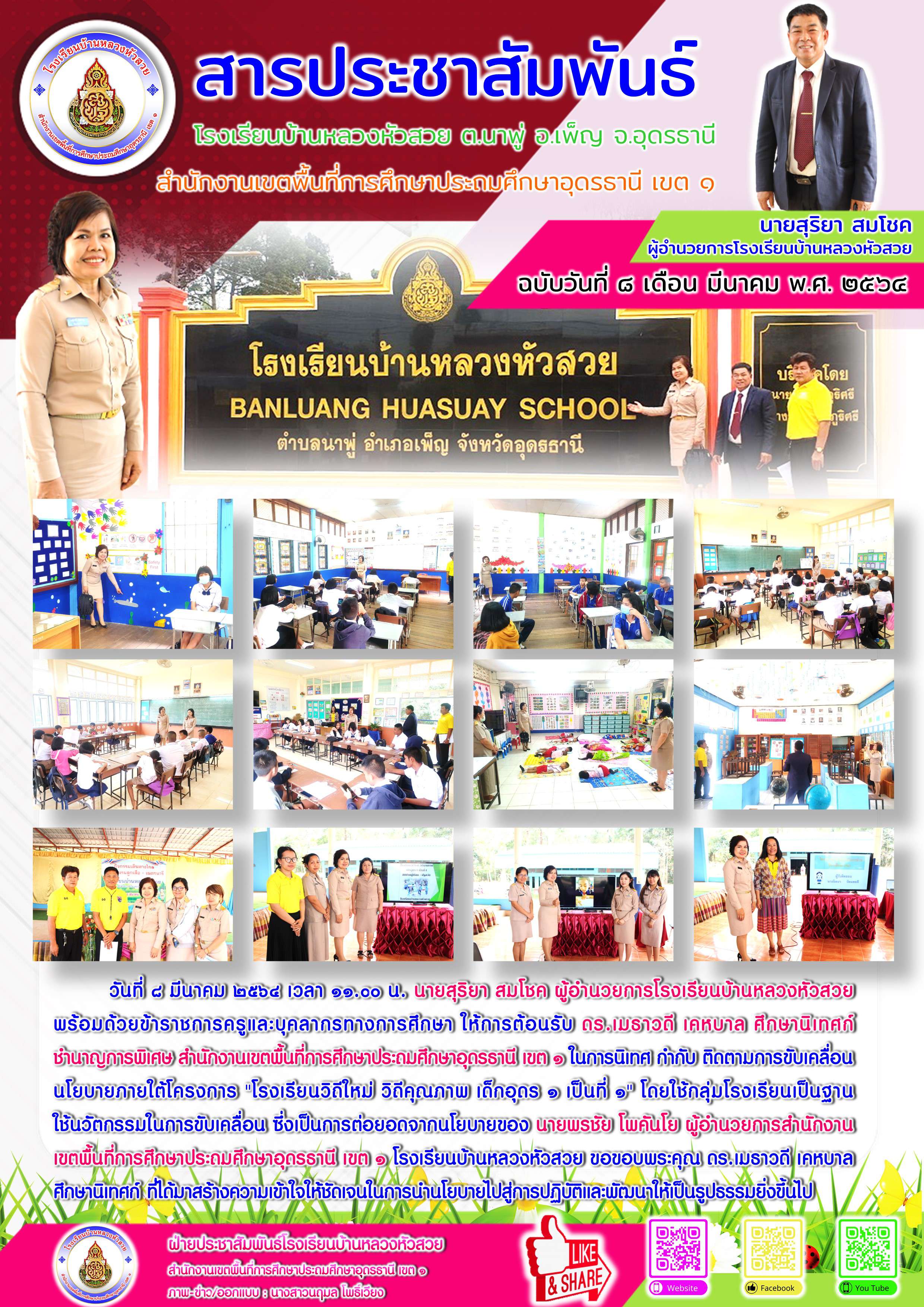 วันที่ ๘ มีนาคม ๒๕๖๔ เวลา ๑๑.๐๐ น. นายสุริยา สมโชค ผู้อำนวยการโรงเรียนบ้านหลวงหัวสวย พร้อมด้วยข้าราชการครูและบุคลากรทางการศึกษา ให้การต้อนรับ ดร.เมธาวดี เคหบาล ศึกษานิเทศก์ ชำนาญการพิเศษ สำนักงานเขตพื้นที่การศึกษาประถมศึกษาอุดรธานี เขต ๑ ในการนิเทศ กำกับ ติดตามการขับเคลื่อนนโยบายภายใต้โครงการ "โรงเรียนวิถีใหม่ วิถีคุณภาพ เด็กอุดร ๑ เป็นที่ ๑" โดยใช้กลุ่มโรงเรียนเป็นฐาน ใช้นวัตกรรมในการขับเคลื่อน ซึ่งเป็นการต่อยอดจากนโยบายของ นายพรชัย โพคันโย ผู้อำนวยการสำนักงานเขตพื้นที่การศึกษาประถมศึกษาอุดรธานี เขต ๑ โรงเรียนบ้านหลวงหัวสวย ขอขอบพระคุณ ดร.เมธาวดี เคหบาล ศึกษานิเทศก์ ที่ได้มาสร้างความเข้าใจให้ชัดเจนในการนำนโยบายไปสู่การปฏิบัติและพัฒนาให้เป็นรูปธรรมยิ่งขึ้นไป