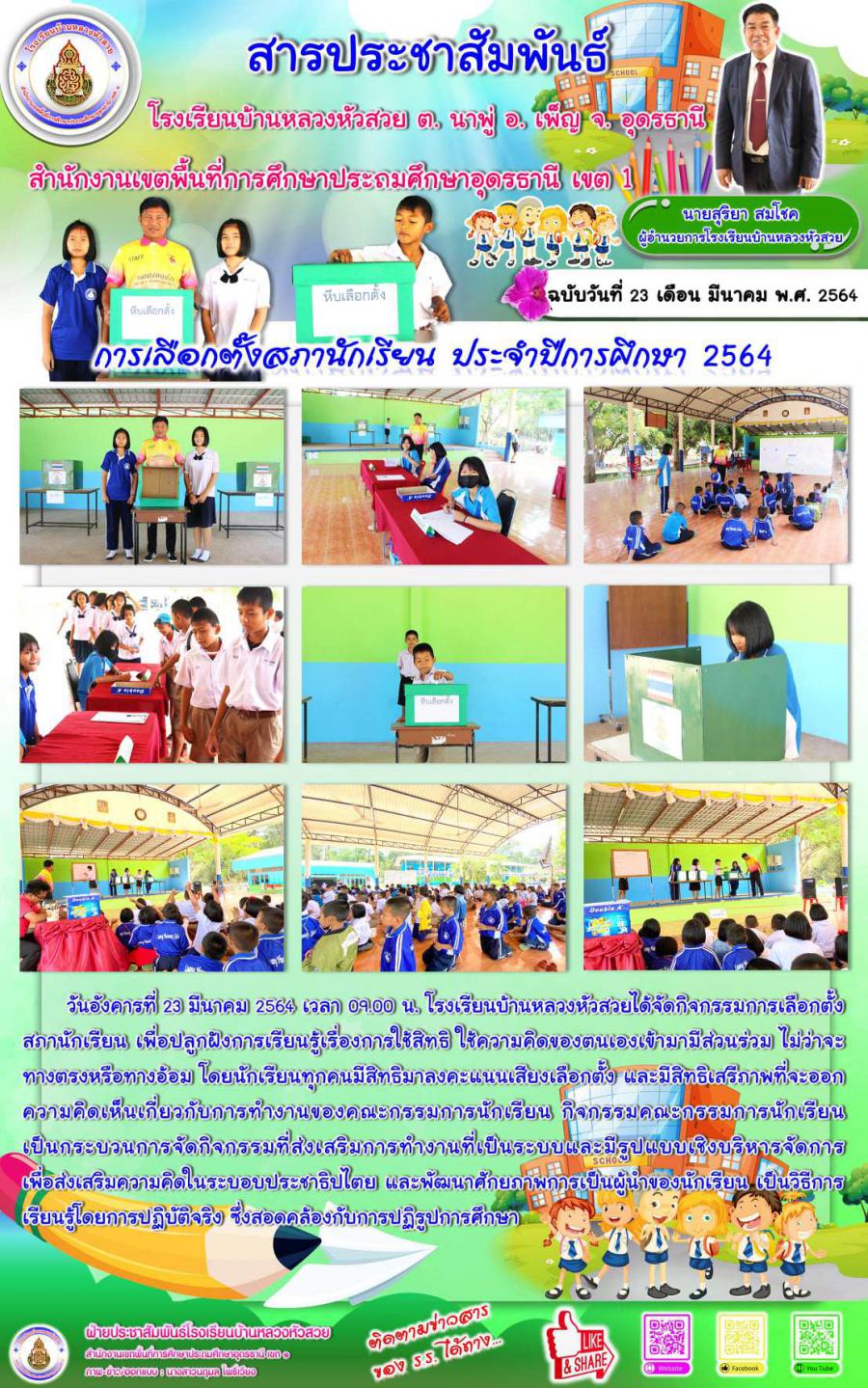 วันอังคารที่ 23 มีนาคม 2564 เวลา 09.00 น. โรงเรียนบ้านหลวงหัวสวยได้จัดกิจกรรมการเลือกตั้งสภานักเรียน เพื่อปลูกฝังการเรียนรู้เรื่องการใช้สิทธิ ใช้ความคิดของตนเองเข้ามามีส่วนร่วม ไม่ว่าจะทางตรงหรือทางอ้อม โดยนักเรียนทุกคนมีสิทธิมาลงคะแนนเสียงเลือกตั้ง และมีสิทธิเสรีภาพที่จะออกความคิดเห็นเกี่ยวกับการทำงานของคณะกรรมการนักเรียน กิจกรรมคณะกรรมการนักเรียน เป็นกระบวนการจัดกิจกรรมที่ส่งเสริมการทำงานที่เป็นระบบและมีรูปแบบเชิงบริหารจัดการ เพื่อส่งเสริมความคิดในระบอบประชาธิปไตย และพัฒนาศักยภาพการเป็นผู้นำของนักเรียน เป็นวิธีการเรียนรู้โดยการปฏิบัติจริง ซึ่งสอดคล้องกับการปฏิรูปการศึกษา