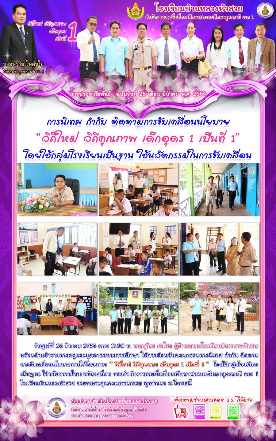 วันศุกร์ที่ 26 มีนาคม 2564 เวลา 11.00 น. นายสุริยา สมโชค ผู้อำนวยการโรงเรียนบ้านหลวงหัวสวย พร้อมด้วยข้าราชการครูและบุคลากรทางการศึกษา ให้การต้อนรับคณะกรรมการนิเทศ กำกับ ติดตามการขับเคลื่อนนโยบายภายใต้โครงการ "วิถีใหม่ วิถีคุณภาพ เด็กอุดร 1 เป็นที่ 1" โดยใช้กลุ่มโรงเรียนเป็นฐาน ใช้นวัตกรรมในการขับเคลื่อน ของสำนักงานเขตพื้นที่การศึกษาประถมศึกษาอุดรธานี เขต 1 โรงเรียนบ้านหลวงหัวสวย ขอขอบพระคุณคณะกรรมการฯ ทุกท่านมา ณ โอกาสนี้