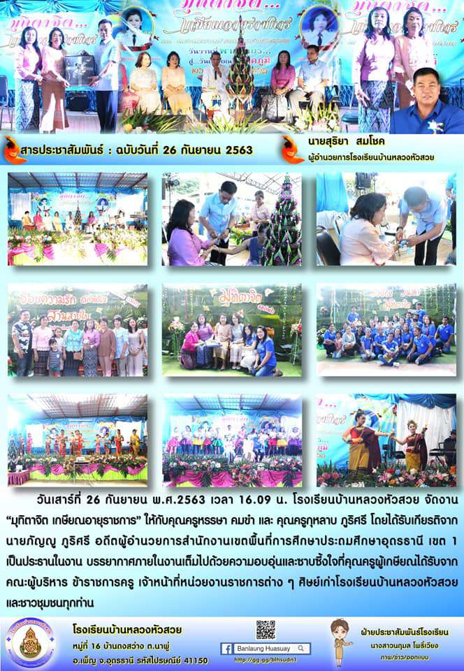 วันเสาร์ที่ 26 กันยายน พ.ศ.2563 เวลา 16.09 น. โรงเรียนบ้านหลวงหัวสวย จัดงาน “มุทิตาจิต เกษียณอายุราชการ” ให้กับคุณครูหรรษา คมขำ และ คุณครูกุหลาบ ภูริศรี โดยได้รับเกียรติจาก นายภัญญู ภูริศรี อดีตผู้อำนวยการสำนักงานเขตพื้นที่การศึกษาประถมศึกษาอุดรธานี เขต 1 เป็นประธานในงาน บรรยากาศภายในงานเต็มไปด้วยความอบอุ่นและซาบซึ้งใจที่คุณครูผู้เกษียณได้รับจากคณะผู้บริหาร ข้าราชการครู เจ้าหน้าที่หน่วยงานราชการต่าง ๆ ศิษย์เก่าโรงเรียนบ้านหลวงหัวสวยและชาวชุมชนทุกท่าน