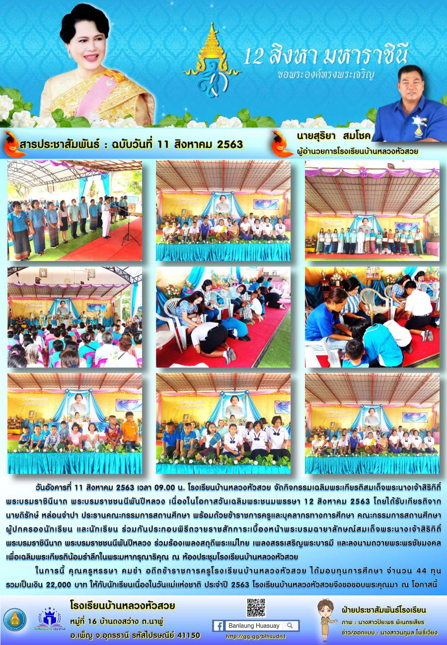 วันอังคารที่ 11 สิงหาคม 2563 เวลา 09.00 น. โรงเรียนบ้านหลวงหัวสวย จัดกิจกรรมเฉลิมพระเกียรติสมเด็จพระนางเจ้าสิริกิติ์ พระบรมราชินีนาถ พระบรมราชชนนีพันปีหลวง เนื่องในโอกาสวันเฉลิมพระชนมพรรษา 12 สิงหาคม 2563 โดยได้รับเกียรติจากนายดิรักษ์ หล่อนจำปา ประธานคณะกรรมการสถานศึกษา พร้อมด้วยข้าราชการครูและบุคลากรทางการศึกษา คณะกรรมการสถานศึกษา ผู้ปกครองนักเรียน และนักเรียน ร่วมกันประกอบพิธีถวายราชสักการะเบื้องหน้าพระบรมฉายาลักษณ์สมเด็จพระนางเจ้าสิริกิติ์ พระบรมราชินีนาถ พระบรมราชชนนีพันปีหลวง ร่วมร้องเพลงสดุดีพระแม่ไทย เพลงสรรเสริญพระบารมี และลงนามถวายพระพรชัยมงคลเพื่อเฉลิมพระเกียรติน้อมรำลึกในพระมหากรุณาธิคุณ ณ ห้องประชุมโรงเรียนบ้านหลวงหัวสวย