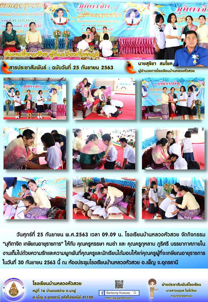วันศุกร์ที่ 25 กันยายน พ.ศ.2563 เวลา 09.09 น. โรงเรียนบ้านหลวงหัวสวย จัดกิจกรรม “มุทิตาจิต เกษียณอายุราชการ” ให้กับ คุณครูหรรษา คมขำ และ คุณครูกุหลาบ ภูริศรี บรรยากาศภายในงานเต็มไปด้วยความรักและความผูกพันที่คุณครูและนักเรียนได้มอบให้แก่คุณครูผู้ที่จะเกษียณอายุราชการ ในวันที่ 30 กันยายน 2563 นี้ ณ ห้องประชุมโรงเรียนบ้านหลวงหัวสวย อ.เพ็ญ จ.อุดรธานี