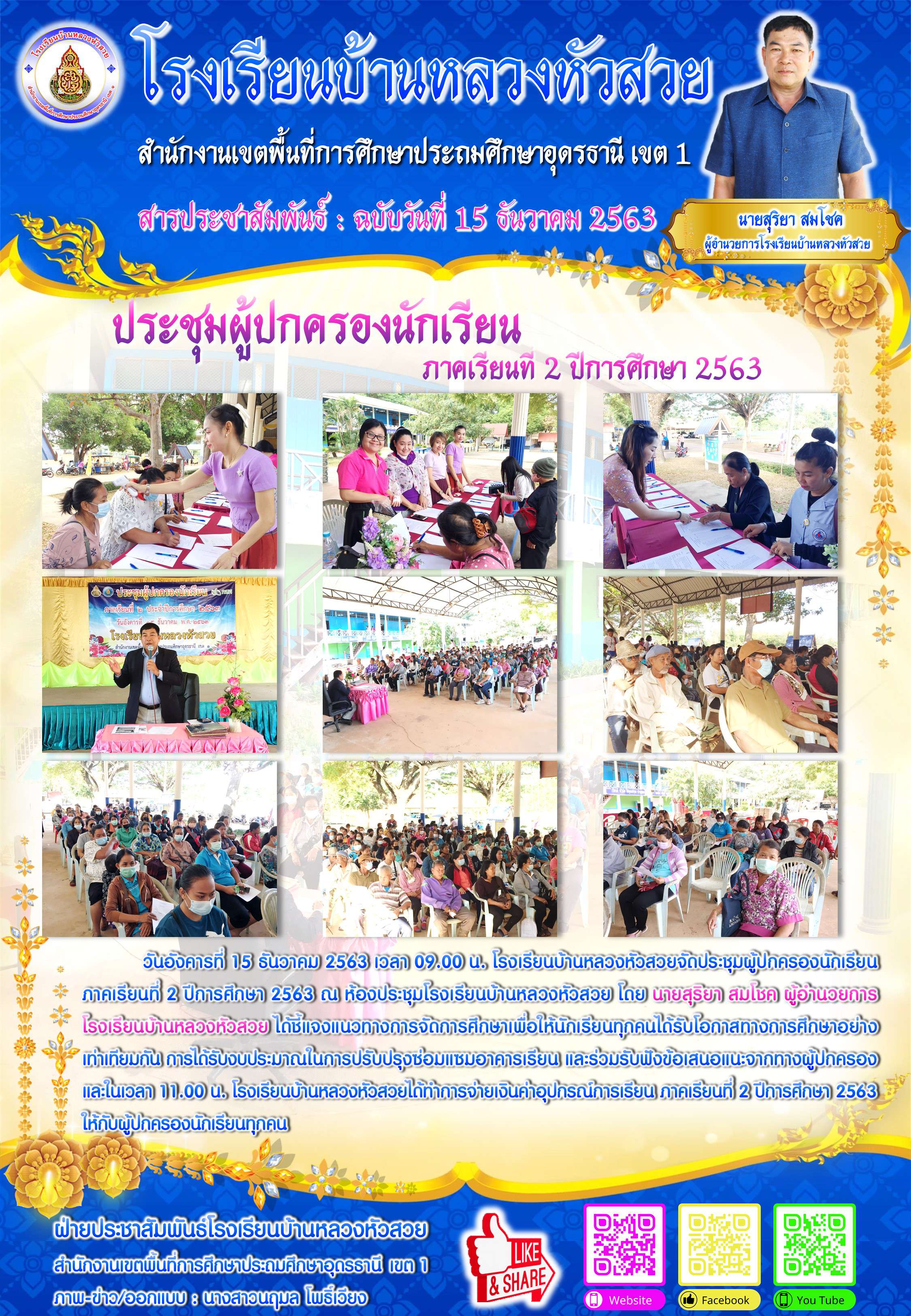 วันอังคารที่ 15 ธันวาคม 2563 เวลา 09.00 น. โรงเรียนบ้านหลวงหัวสวยจัดประชุมผู้ปกครองนักเรียน  ภาคเรียนที่ 2 ปีการศึกษา 2563 ณ ห้องประชุมโรงเรียนบ้านหลวงหัวสวย โดย นายสุริยา สมโชค ผู้อำนวยการโรงเรียนบ้านหลวงหัวสวย ได้ชี้แจงแนวทางการจัดการศึกษาเพื่อให้นักเรียนทุกคนได้รับโอกาสทางการศึกษาอย่างเท่าเทียมกัน การได้รับงบประมาณในการปรับปรุงซ่อมแซมาคารเรียน และร่วมรับฟังข้อเสนอแนะจากทางผู้ปกครอง และในเวลา 11.00 น. โรงเรียนบ้านหลวงหัวสวยได้ทำการจ่ายเงินค่าอุปกรณ์การเรียน ภาคเรียนที่ 2 ปีการศึกษา 2563ให้กับผู้ปกครองนักเรียนทุกคน